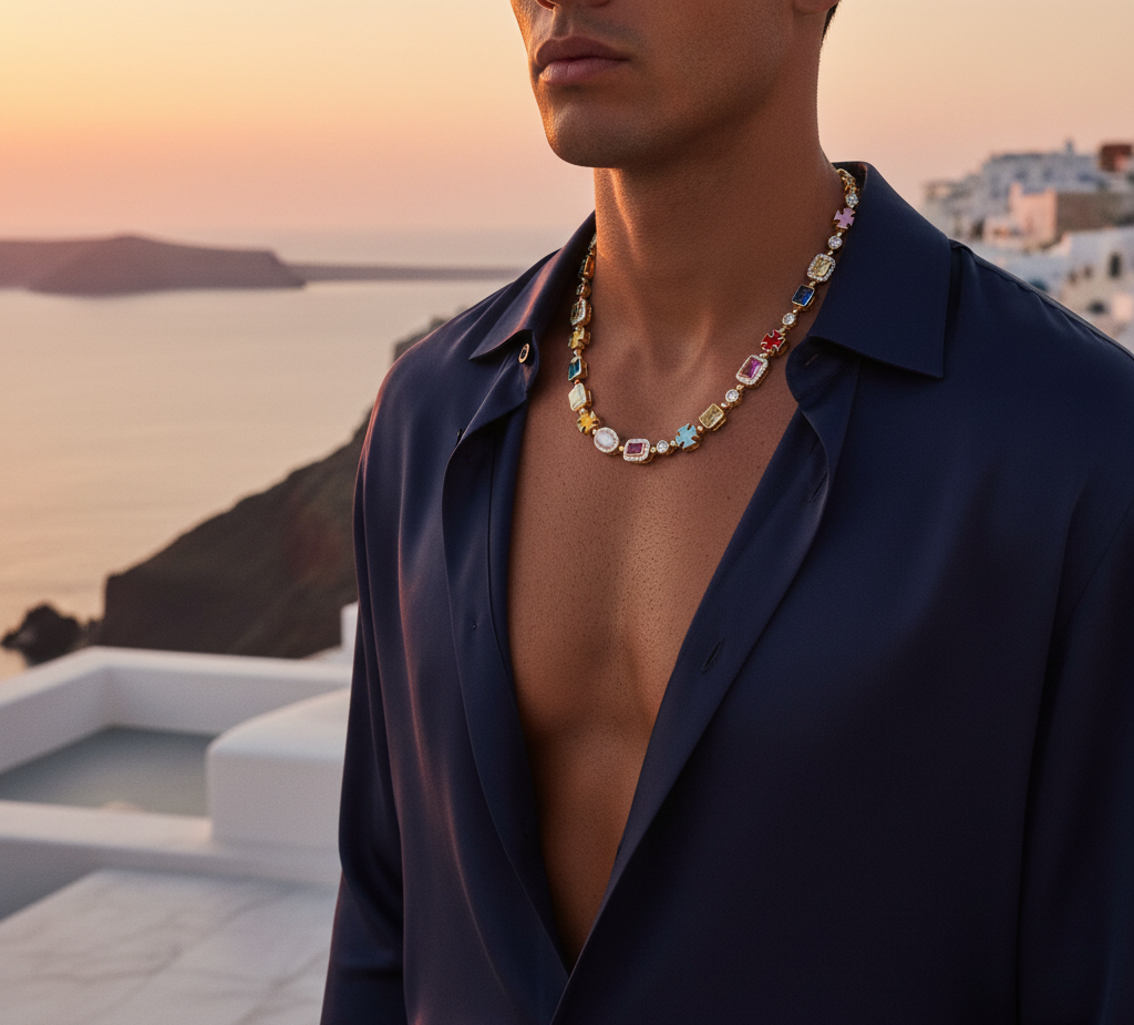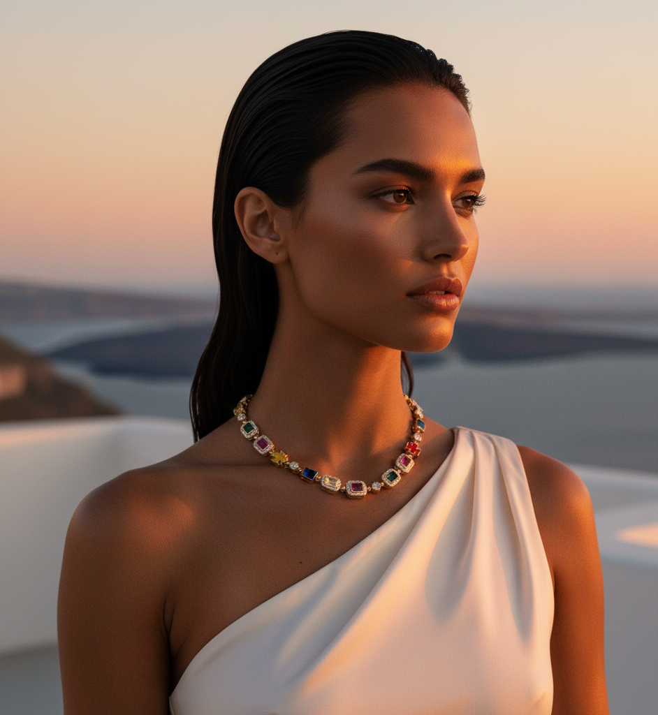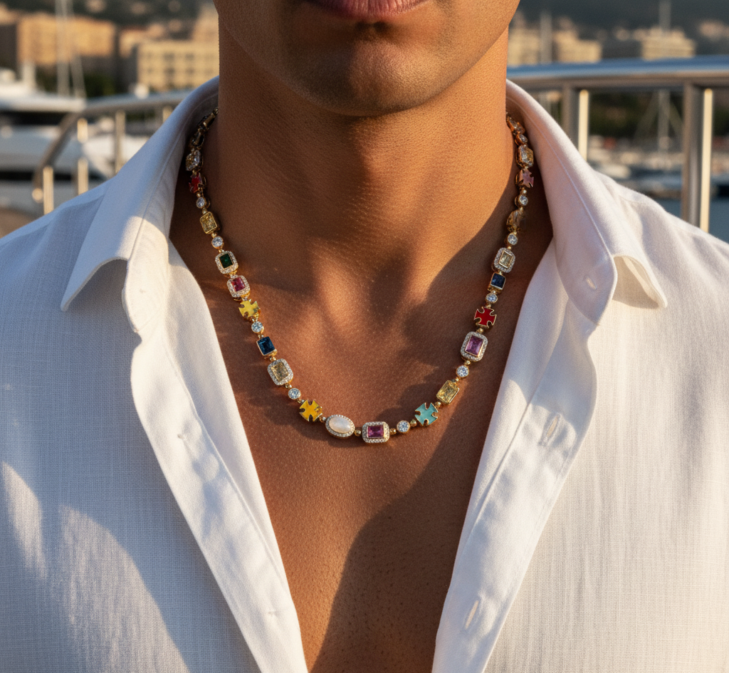 Unleash bold sophistication with the Alaric Chain, a masterpiece of vibrant elegance. Featuring a striking array of multicolored gemstones, this statement piece is meticulously crafted to add a luxurious touch to any outfit. The intricate design showcases radiant cubic zirconia stones, each set within 18K gold-plated stainless steel, ensuring lasting brilliance.