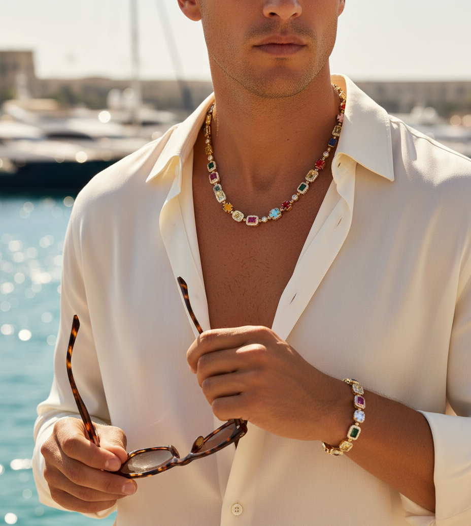 Step into luxury with the Alaric Set, a stunning ensemble designed to captivate. Featuring the Alaric Chain and Alaric Bracelet, this set is adorned with vibrant multicolored gemstones and shimmering 5A CZ stones, creating a striking contrast against its high-quality brass base with 18K gold plating. Whether worn together for a bold statement or separately for subtle sophistication, the Alaric Set is the ultimate addition to your jewelry collection.