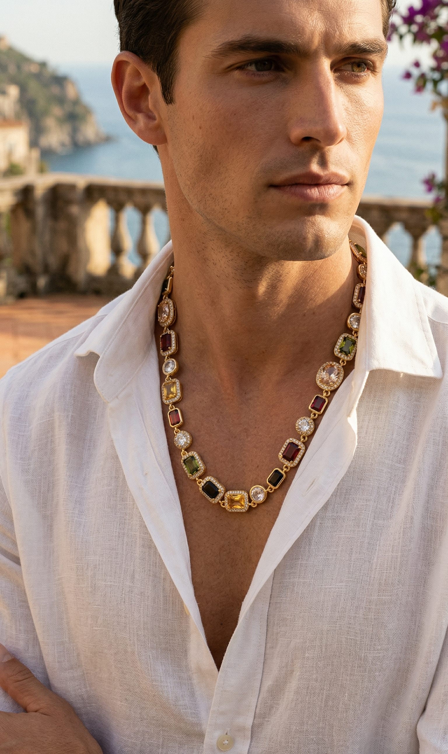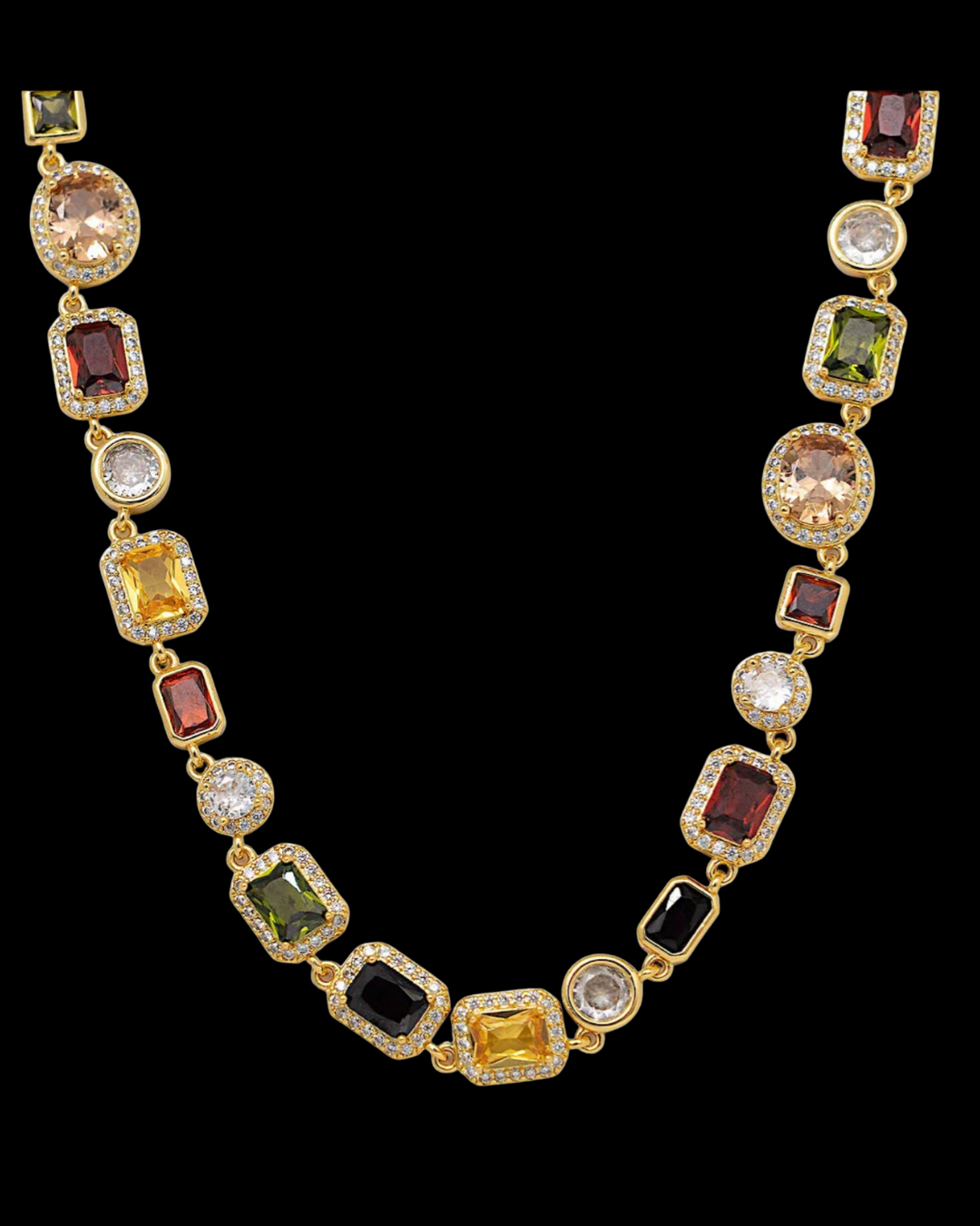 The Astra Chain features multicolored gemstones, including red and blue cubic zirconia, that add a splash of color to any outfit. These vibrant stones are set in a stunning design that captures light beautifully.