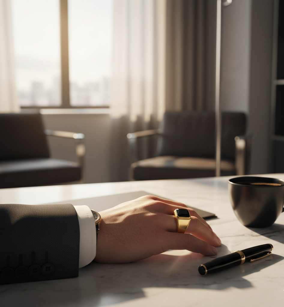 Cael’s signet silhouette reads with immediate authority — the deep black crystal and mirror-finish gold create a commanding contrast that draws the eye. Worn on the index or ring finger, it anchors a look with minimal yet unmistakable presence.