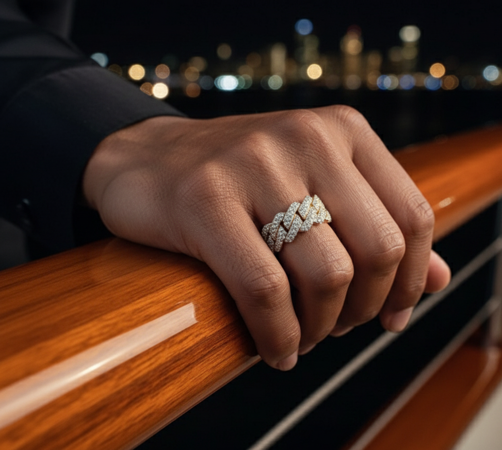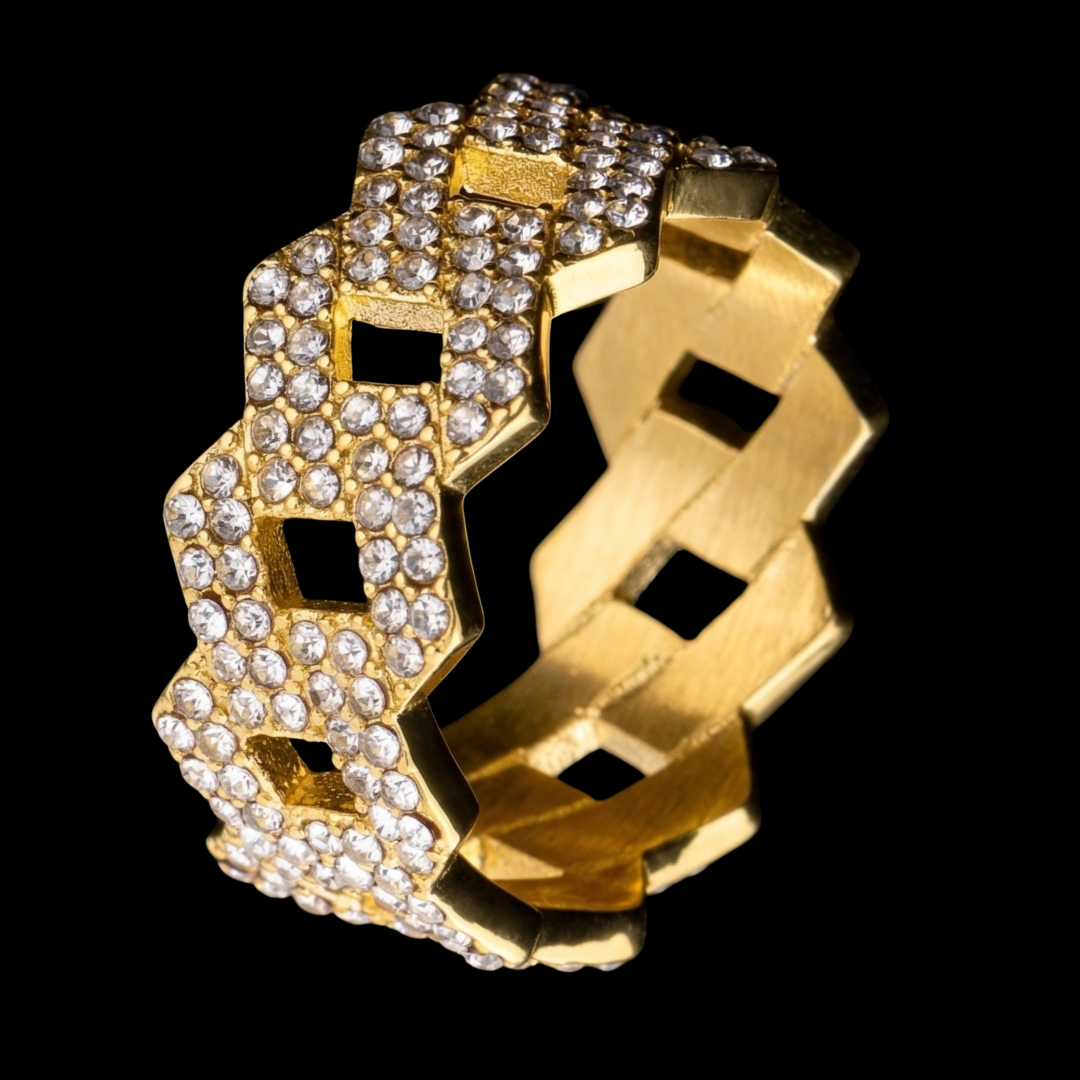 The bold Cuban link design of the Elara Ring adds a touch of sophistication and style, making it a standout piece in any jewelry collection. Its intricate detailing is both modern and timeless.