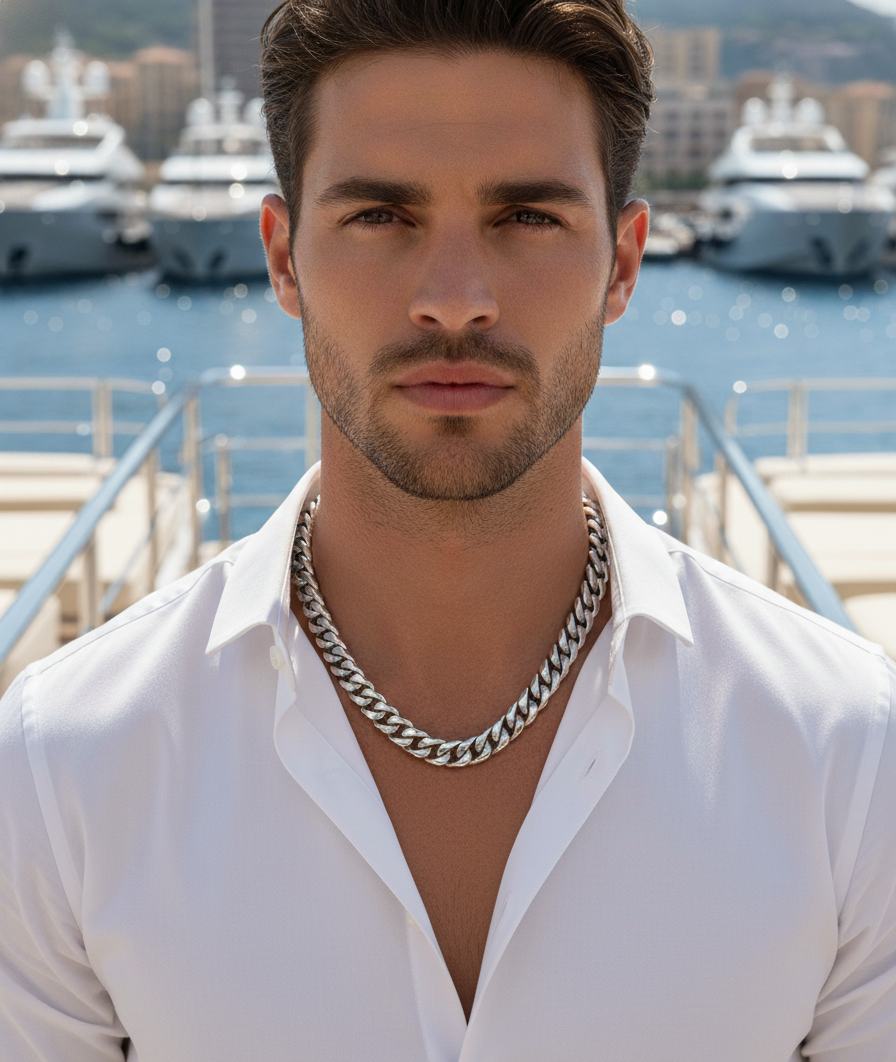 The Ember Chain in 18K White Gold is crafted for those who want their presence felt without saying a word. Each heavyweight Cuban link is built from solid 316L stainless steel — the same grade used in fine watch casings — and coated with three layers of mirror-finish 18K white gold, electroplated to a premium 0.8-micron thickness for unmatched brilliance.