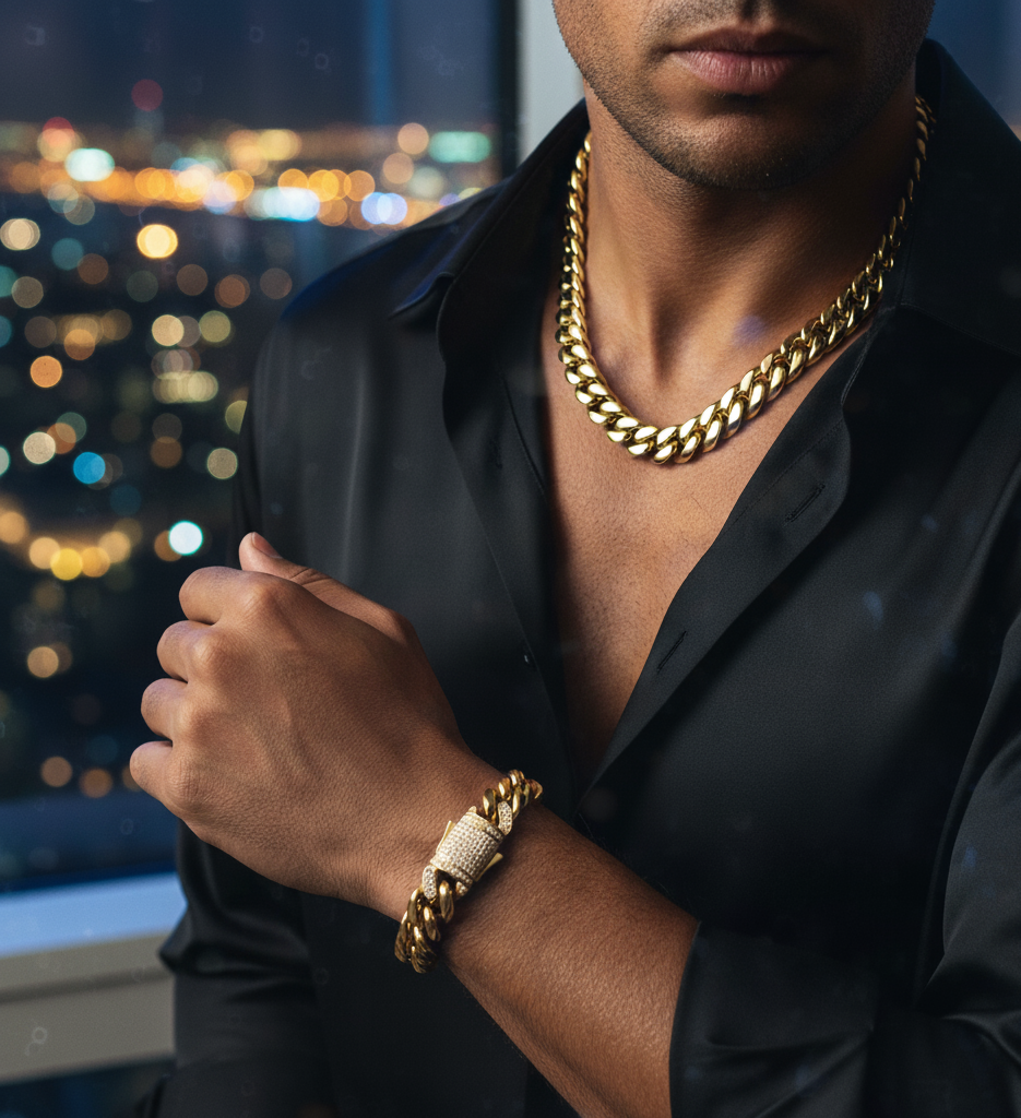 The Ember Set is designed to outshine and outlast. Every link — from chain to bracelet — is coated with three layers of mirror-finish 18K gold, electroplated to a 0.8-micron thickness over solid 316L stainless steel — the same high-grade base used in fine timepiece casings.