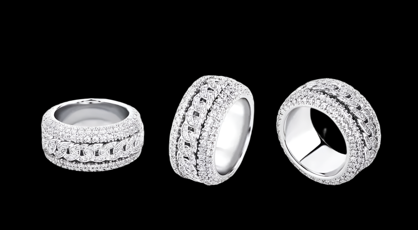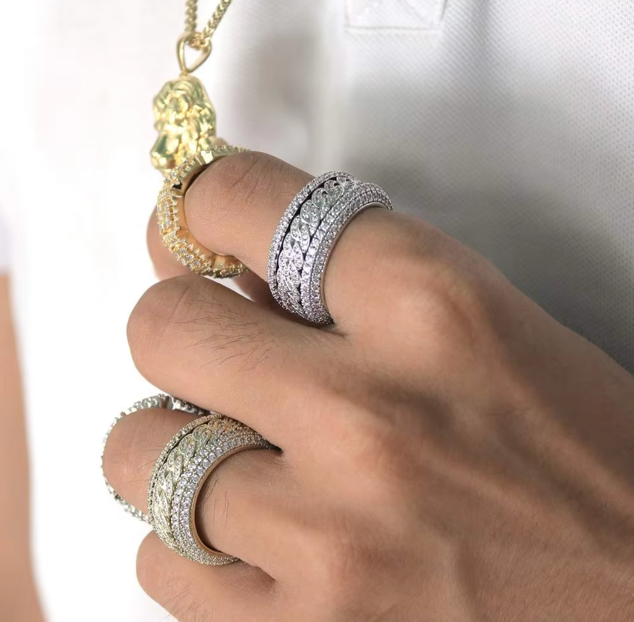 The Enzo Ring showcases a unique movable Cuban link structure that not only looks stunning but also allows for comfort and flexibility. Each hand-set cubic zirconia stone captures and reflects light beautifully, making this ring a true standout piece.