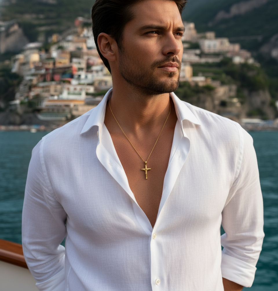 The Lucius Pendant redefines the crucifix with a blend of sacred symbolism and contemporary luxury. Crafted in 18K gold-plated 316L stainless steel, it embodies devotion, power, and everlasting light. The sculpted figure of Christ reflects precision and reverence, turning this piece into more than jewelry — it’s a statement of faith refined by design.