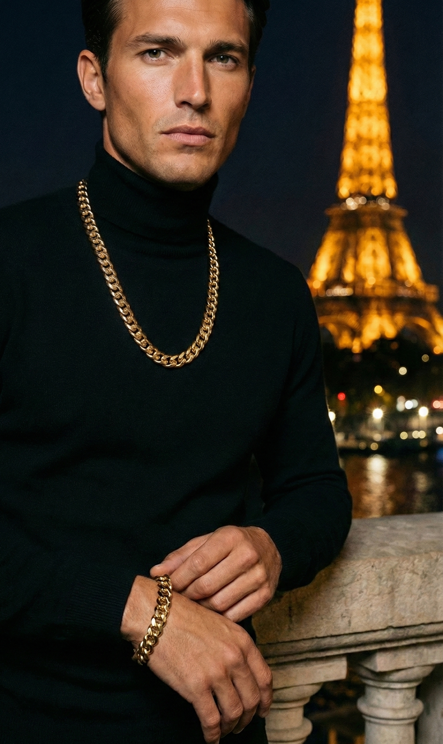Make an unforgettable statement with The Luxor Set in Gold, a powerful fusion of strength and luxury. This striking Cuban link chain and matching bracelet are crafted with premium 18K gold plating over 316L stainless steel, ensuring a high-shine finish and unmatched durability. Designed for those who demand excellence, this set is waterproof, tarnish-resistant, and heatproof, built to withstand everyday wear while maintaining its pristine brilliance.
