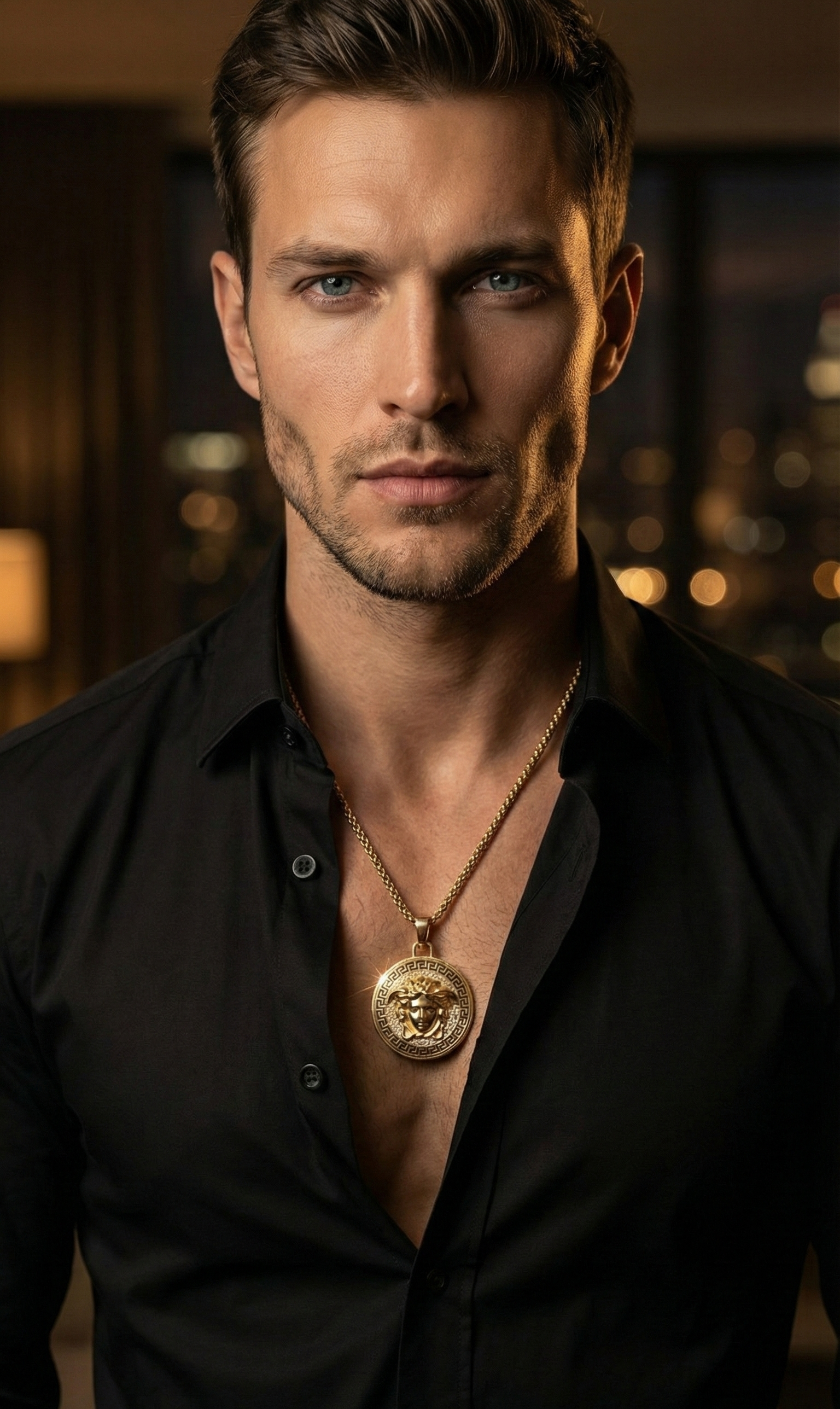 The Medusa Pendant transforms a mythical symbol into a modern luxury statement — a bold medallion framed with crystal brilliance, suspended on a perfectly weighted chain.