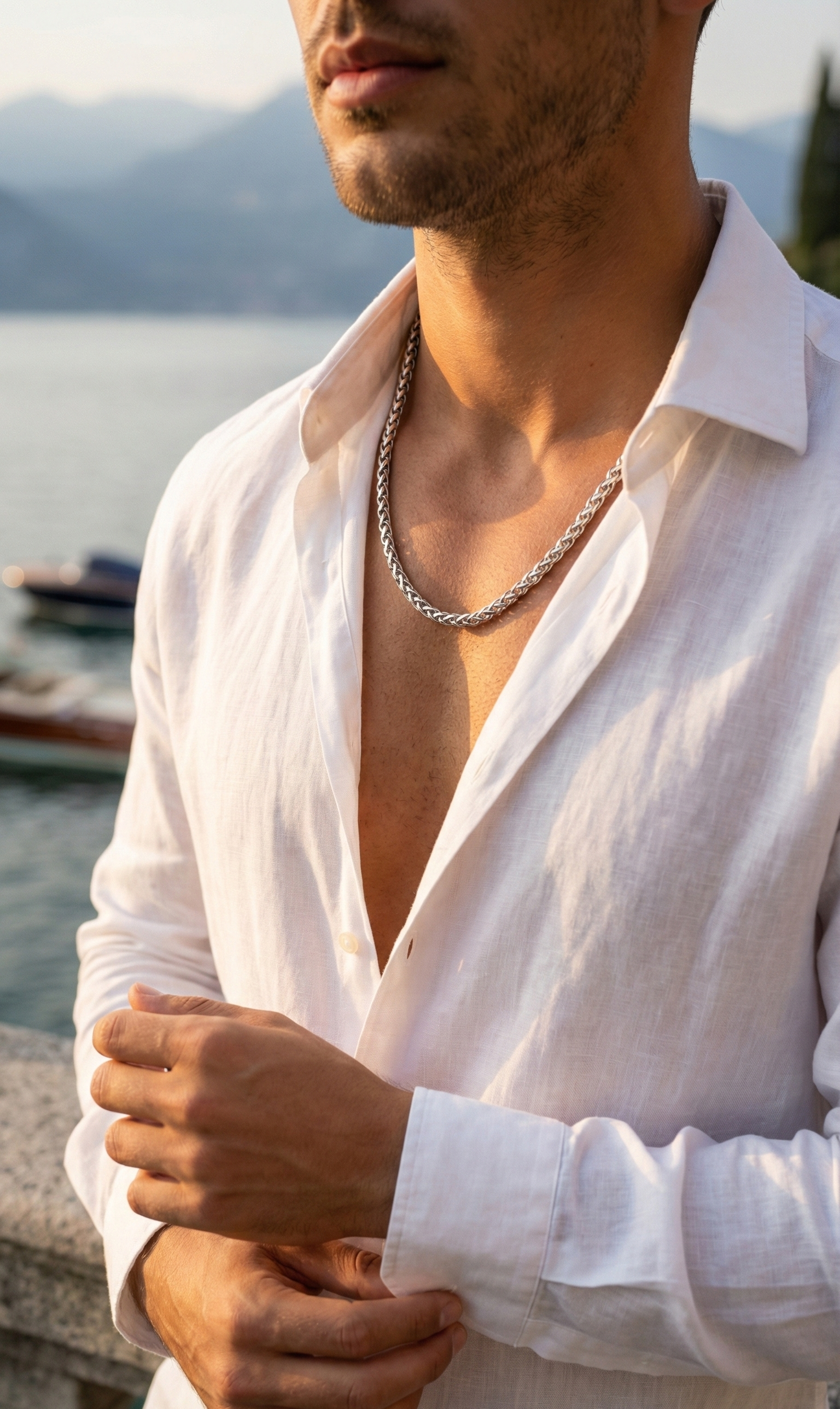 The Regent Chain in Silver is a refined essential — a woven wheat-link design crafted for those who prefer quiet luxury with undeniable presence. Its intricate braided structure creates a smooth, fluid drape that reflects light with a cool, high-end white-gold sheen, making it one of the most elevated everyday pieces you can wear.