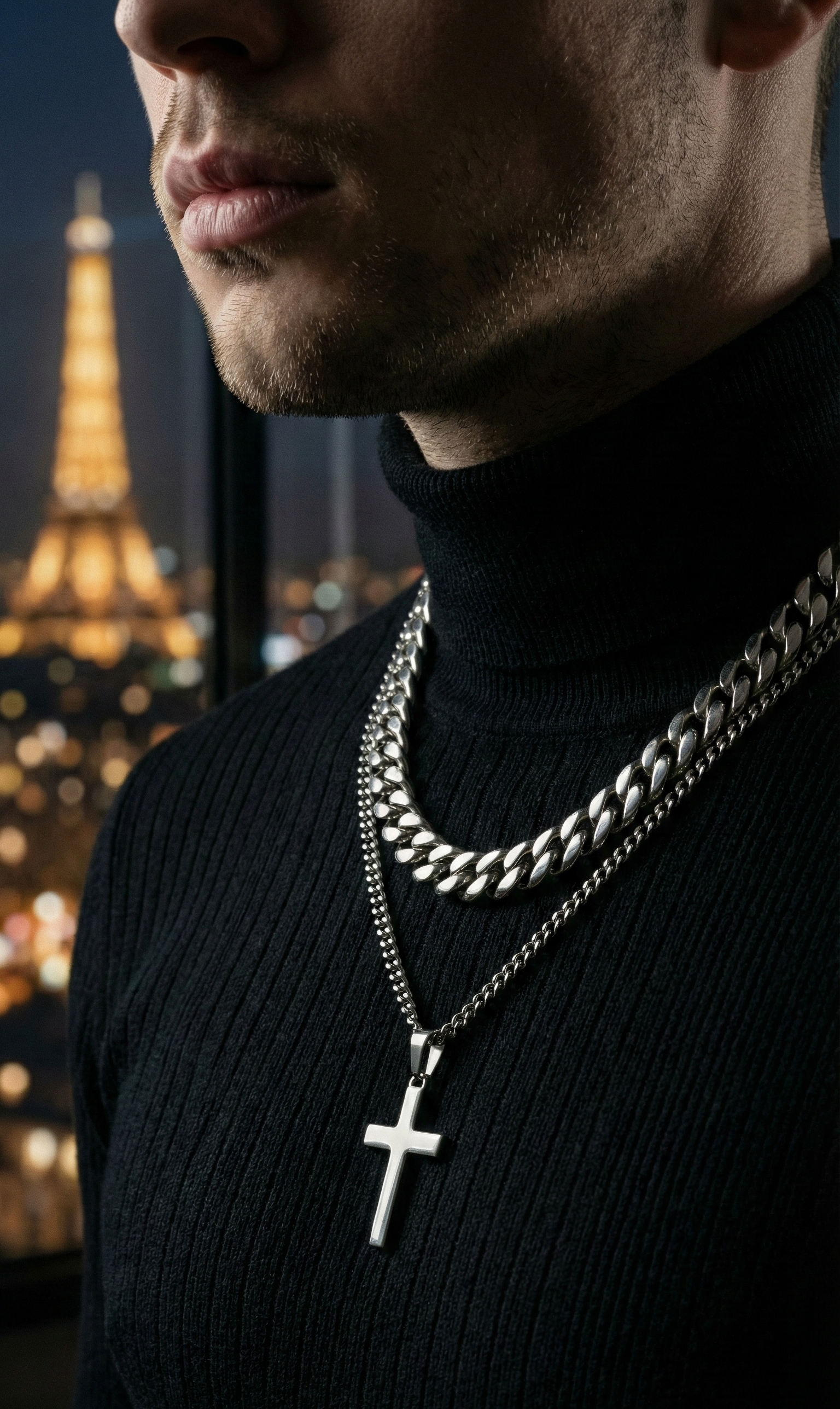 The Sanctum Set in 18K White Gold pairs the heavyweight Luxor Cuban Chain with the sharp, iconic Aure Cross Pendant — a silver-toned statement engineered for modern power and everyday luxury.